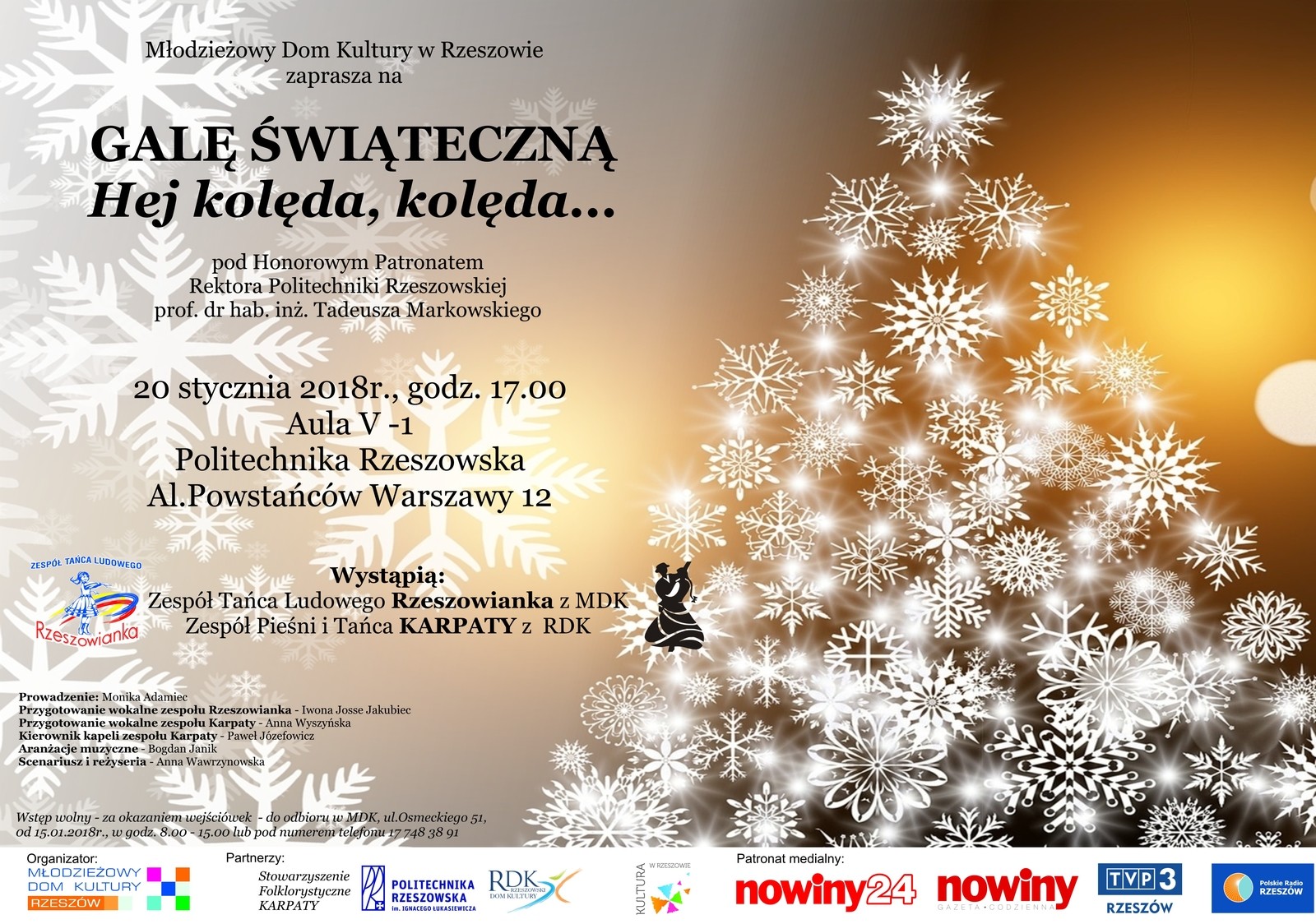 Młodzieżowy Dom Kultury w Rzeszowie zaprasza na Galę Świąteczną Hej kolęda, kolęda...". Gala odbędzie się 20 stycznia o godzinie 17.00 w auli V-1 Politechniki Rzeszowskiej. Patronat honorowy nad koncertem objął rektor Politechniki Rzeszowskiej prof. dr hab. inż. Tadeusz Markowski.